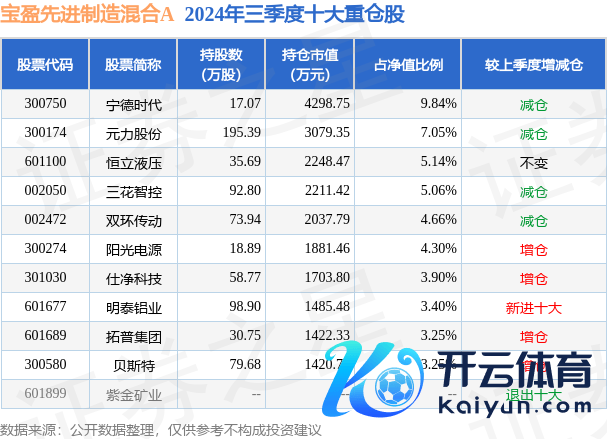 宝盈先进制造羼杂A为羼杂型-纯真基金,凭证最新一期基金季报知道,该基金钞票成就:股票占净值比88.45%,无债券类钞票,现款占净值比12.56%。基金十大重仓股如下:
